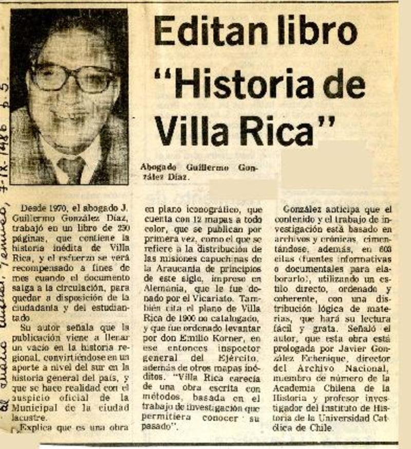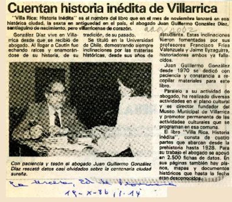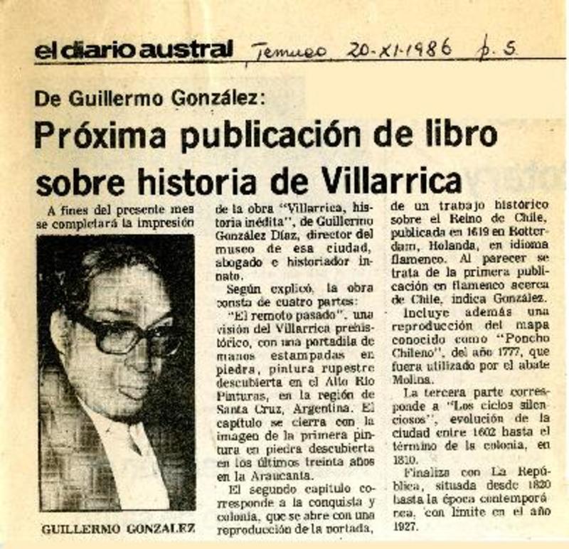 Próxima publicación de libro sobre historia de Villarrica [artículo].