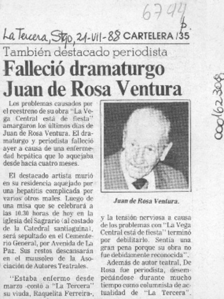 Falleció dramaturgo Juan de Rosa Ventura [artículo].
