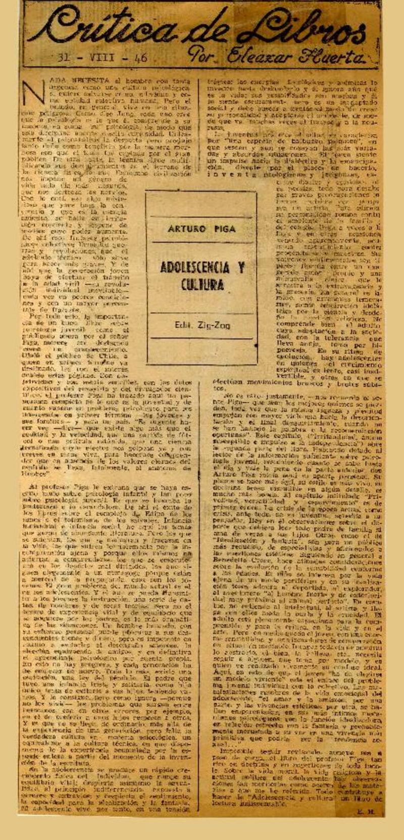 Autores chilenos - Piga Dacchena, Arturo - Adolescencia y cultura