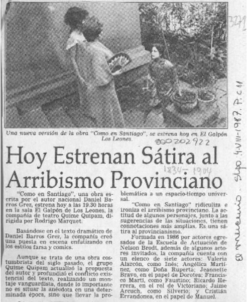 Hoy estrenan sátira al arribismo provinciano [artículo].