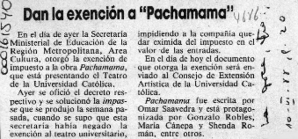 Dan la exención a "Pachamama" [artículo].