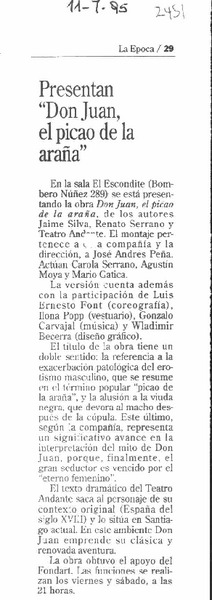 Presentan "Don Juan, el picao de la araña". [artículo]