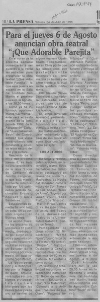 Obra teatral "Qué adorable parejita" anuncian para el jueves 6 de agosto [artículo].