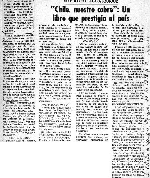 Chile, nuestro cobre,un libro que prestigia al país. [artículo]