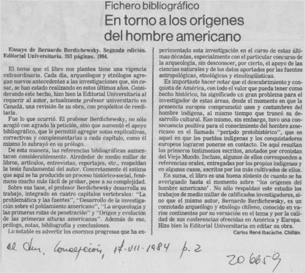 Autores chilenos - En torno a los orígenes del hombre americano - Berdichewsky Scher, Bernardo