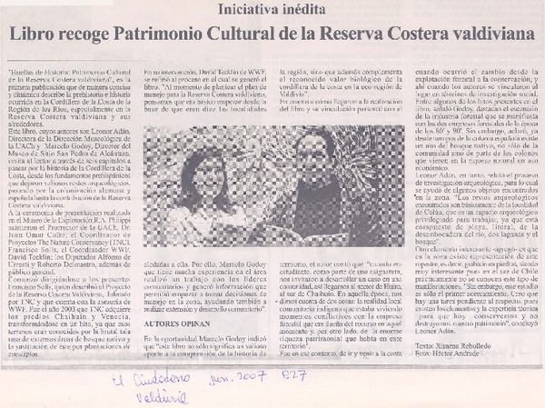 Libro recoge patrimonio cultural de la reserva costera valdiviana [artículo]Ximena Rebolledo.