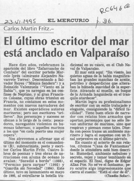 El último escritor del mar está anclado en Valparaíso [artículo] Claudio Solar.