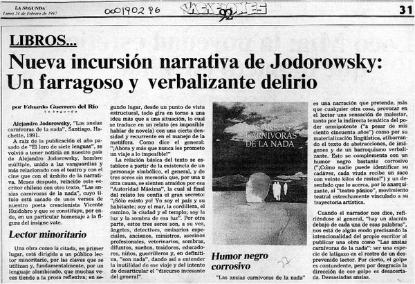 Nueva incursión narrativa de Jodorowsky, un farragoso y verbalizante delirio [artículo] Eduardo Guerrero del Río.