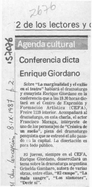 Enrique Giordano dictará charlas sobre el teatro [artículo].