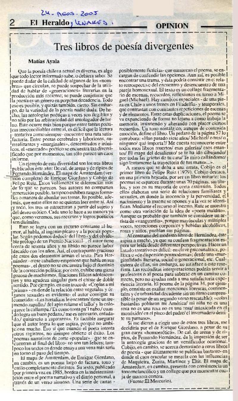Tres libros de poesía divergentes [artículo]Matías Ayala.