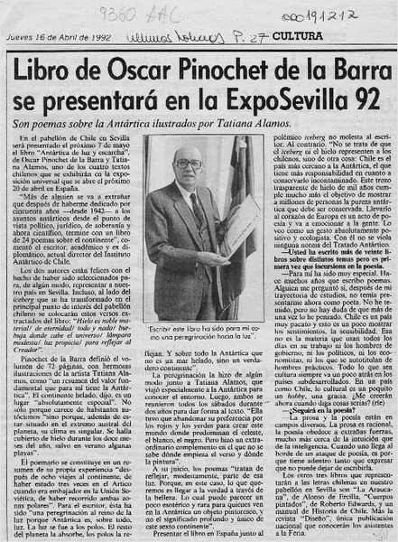 Libro de Oscar Pinochet de la Barra se presentará en la ExpoSevilla 92 [artículo].