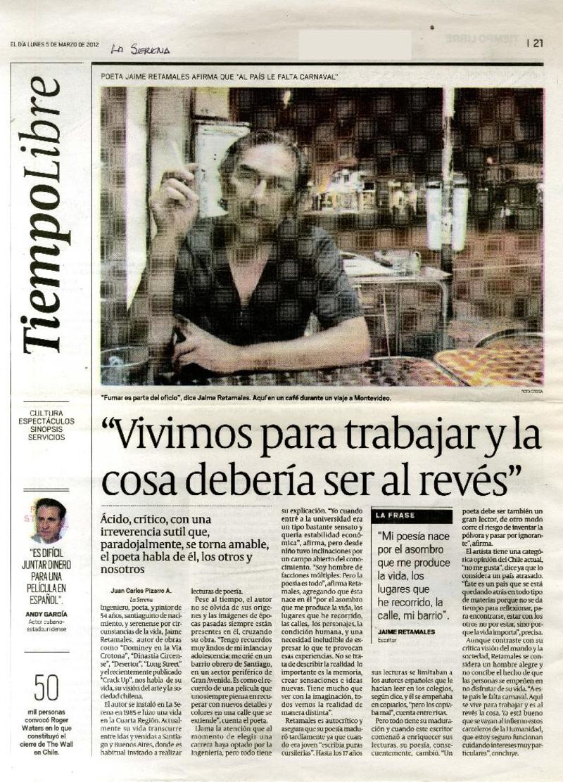 "Vivimos para trabajar y la cosa debería ser al réves" [artículo] Juan Carlos Pizarro A.