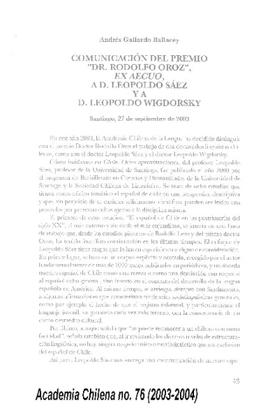 Comunicación del Premio "Dr. Rodolfo Oroz", a D. Leopoldo Sáez y a D. Leopoldo Wigdorsky [artículo] Andrés Gallardo Ballacey.