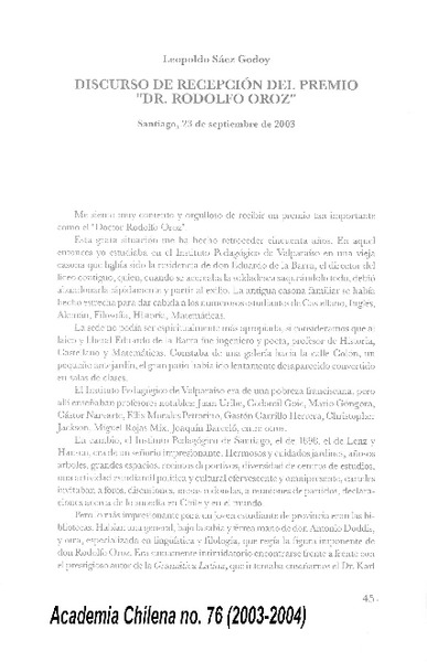Discurso de recepción del Premio "Dr. Rodolfo Oroz" [artículo] Leopoldo Sáez Godoy.