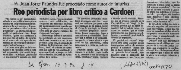 Cardoen se querelló contra periodista [artículo] Guillermo Villar.