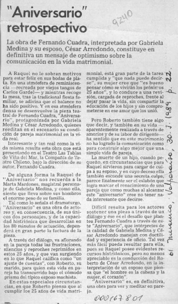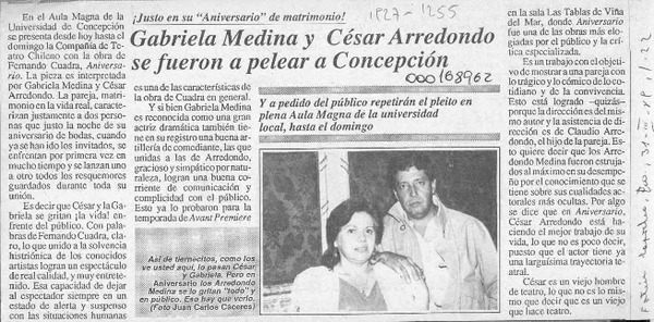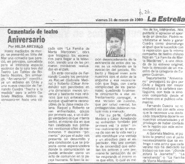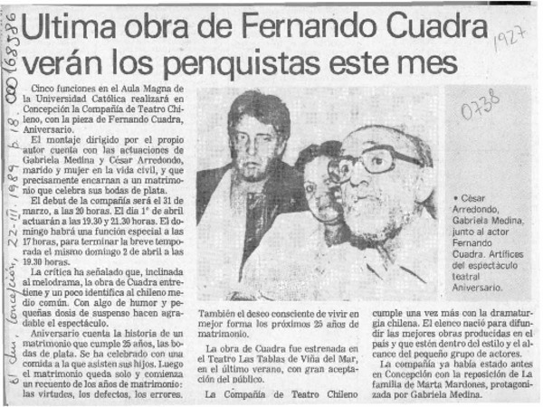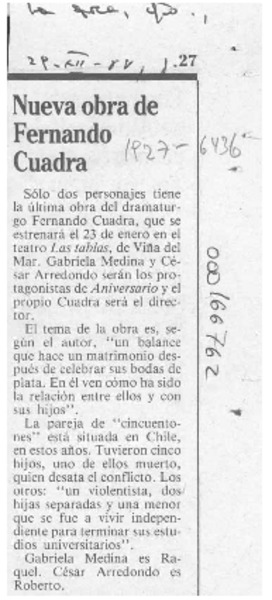 Ultima obra de Fernando Cuadra, "Aniversario", estrena en Viña el matrimonio Arredondo-Medina [artículo].