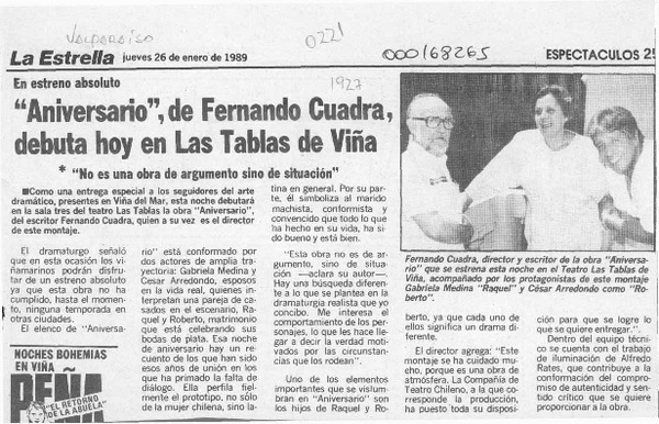 "Aniversario", de Fernando Cuadra, debuta hoy en Las Tablas de Viña [artículo].