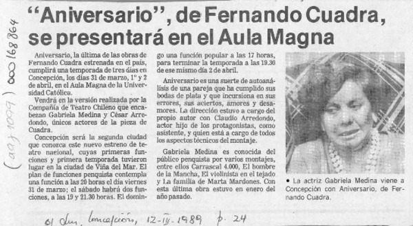 "Aniversario", de Fernando Cuadra, se presentará en el Aula Magna [artículo].