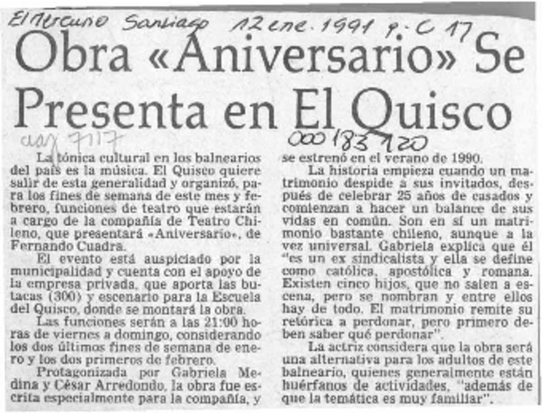 Obra "Aniversario" se presenta en El Quisco [artículo].
