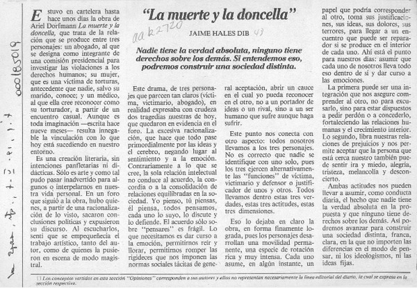 "La muerte y la doncella" [artículo] Jaime Hales Dib.