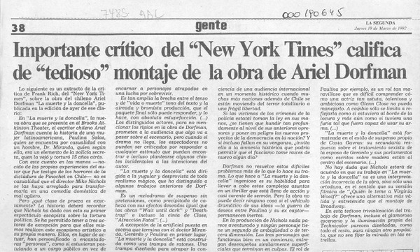 Importante crítico del "New York Times" califica de "tedioso" montaje de la obra de Ariel Dorfman [artículo]