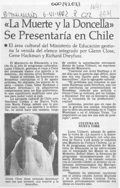 "La Muerte y la doncella" se presentaría en Chile [artículo]