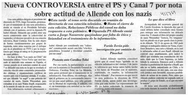 Nueva controversia entre el PS y Canal 7 por nota sobre actitud de Allende con los nazis [artículo]
