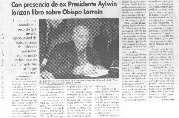 Con presencia de ex Presidente Aylwin lanzan libro sobre Obispo Larraín [artículo] Juan José Vega.