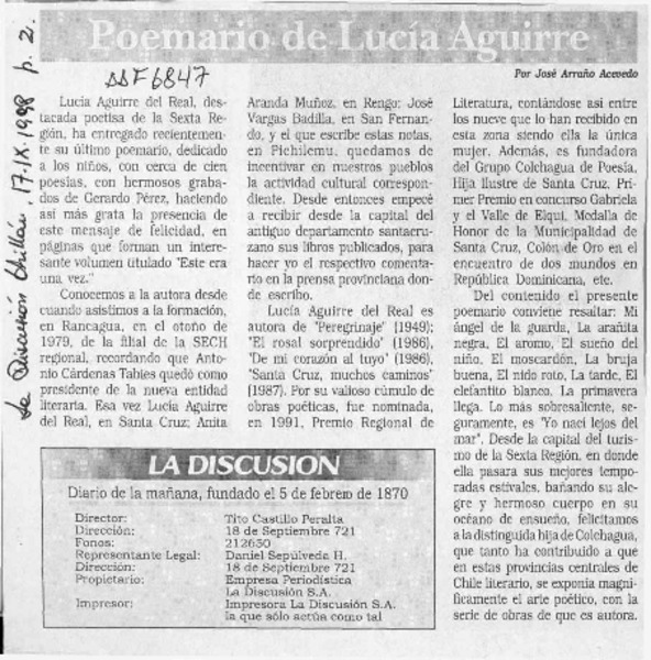 Poemario de Lucía Aguirre [artículo] José Arraño Acevedo.