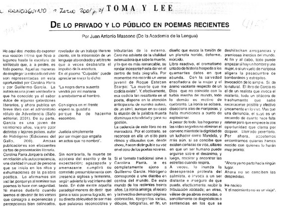 De lo privado y lo público en poemas recientes [artículo] Juan Antonio Massone.