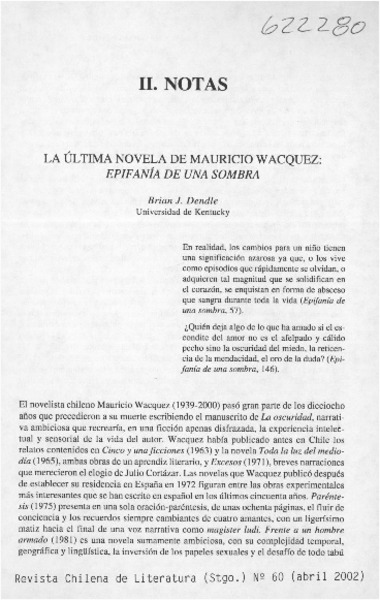 La última novela de Mauricio Wacquez, Epifanía de una sombra [artículo] Brian J. Dendle.