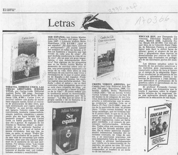 Autores chilenos - Autores españoles - CELA, CAMILO JOSE - MARIAS, JULIAN - CRISTO VERSUS ARIZONA - LEON, CARLOS - TODAVIA ; SOBRINO UNICO ; LAS VIEJAS AMISTADES ; SUELDO VITAL - COROMINAS, FERNANDO - EDUCAR HOY - SER ESPAÑOL