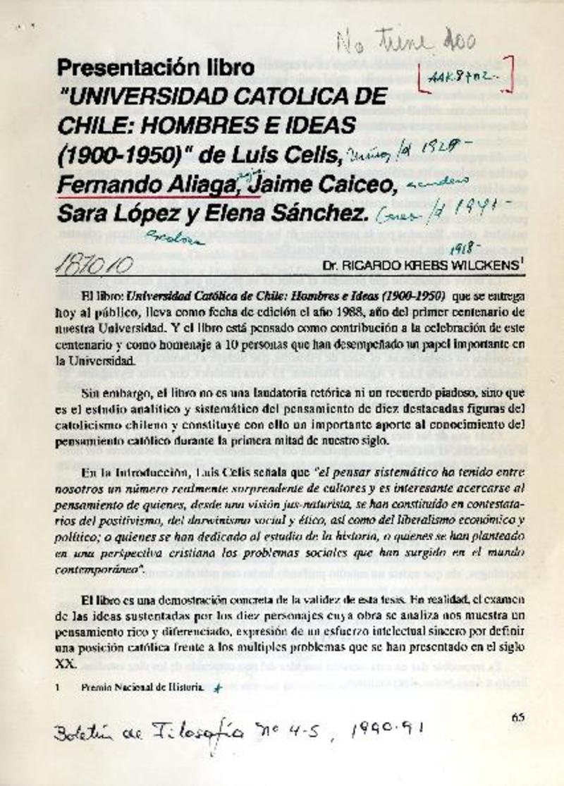 Presentación libro "Universidad Católica de Chile; hombres e ideas (1900-1950)" [artículo] Ricardo Krebs Wilckens.