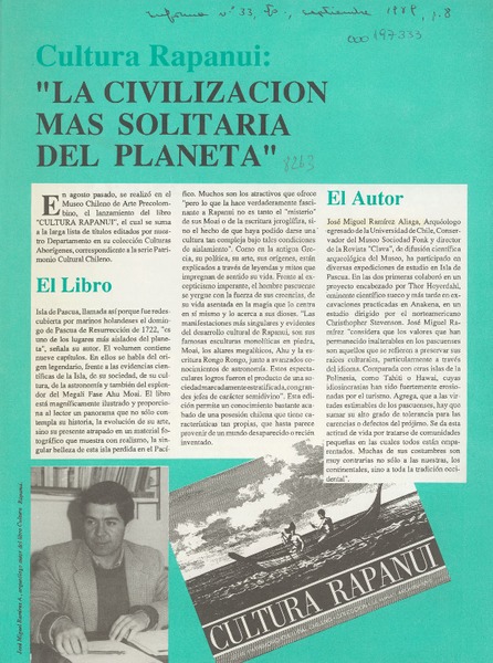"Cultura Rapanui", un ensayo de José Miguel Ramírez Aliaga [artículo] Bernardo Soria.