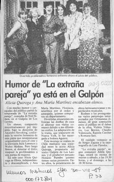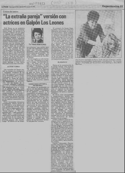 "La extraña pareja" versión con actrices en Galpón Los Leones [artículo] Yolanda Montecinos.