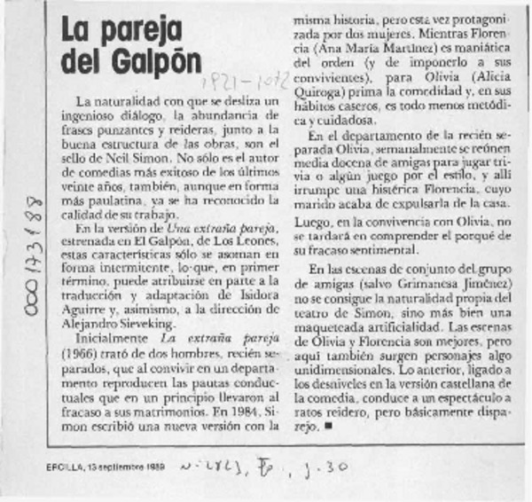 "Extraña pareja" se instala en El Galpón [artículo].