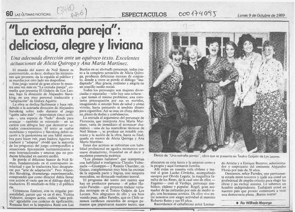 "La extraña pareja", deliciosa, alegre y liviana [artículo] Wilfredo Mayorga.