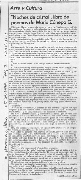 "Noches de cristal", libro de poemas de Mario Cánepa G. [artículo] Isabel Barrientos Díaz.