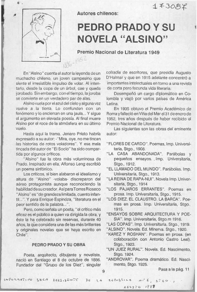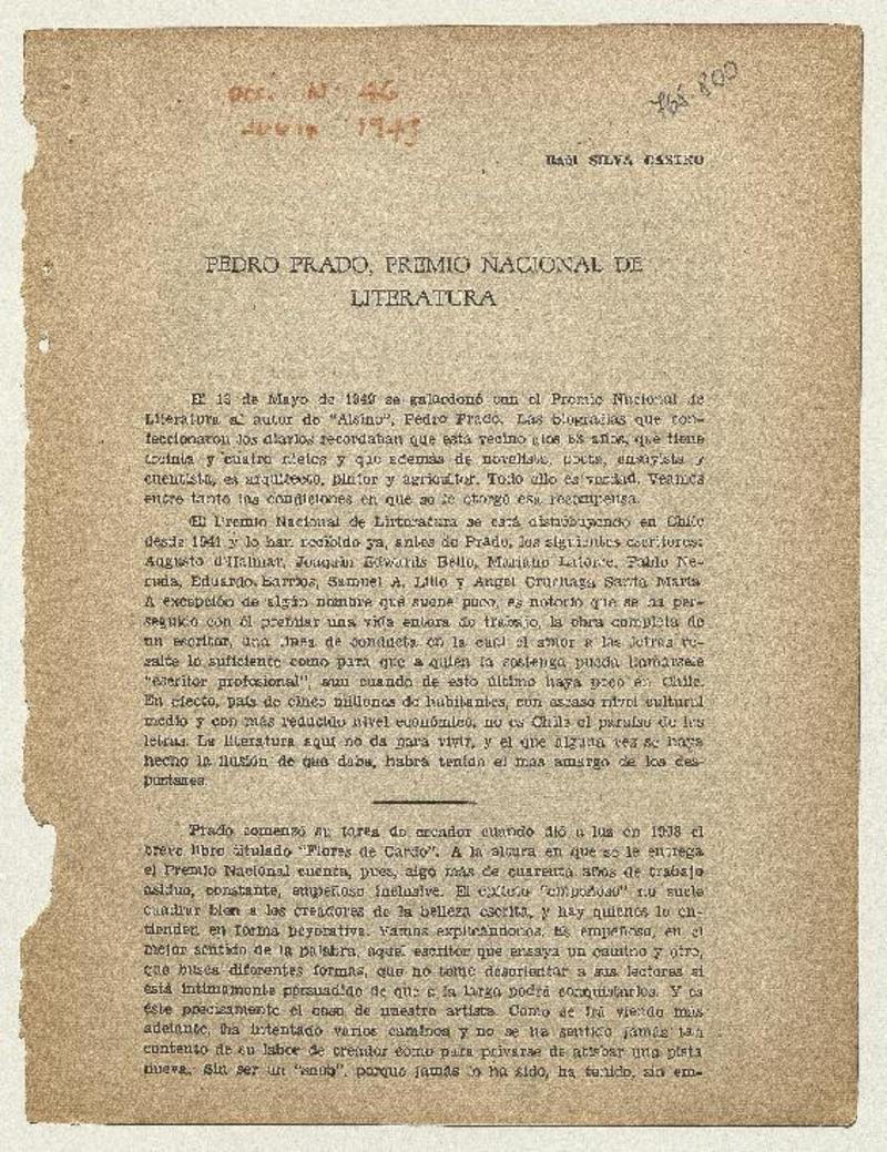 Pedro Prado, Premio Nacional de Literatura [artículo] Raúl Silva Castro.