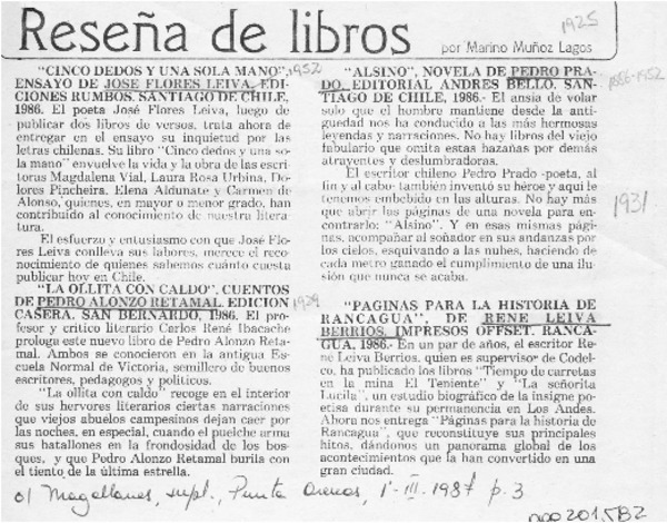 Reseña de libros [artículo] Marino Muñoz Lagos.