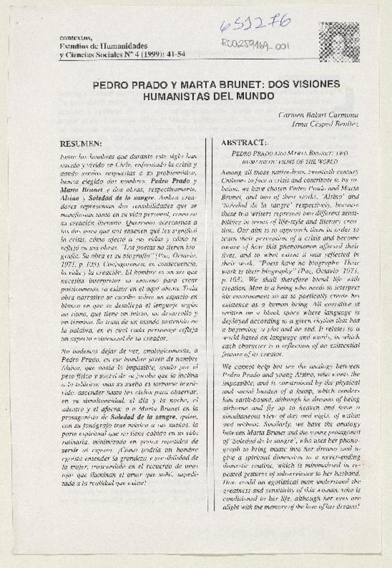 Pedro Prado y Marta Brunet, dos visiones humanistas del mundo [artículo] Carmen Balart Carmona <y> Irma Césped Benítez.
