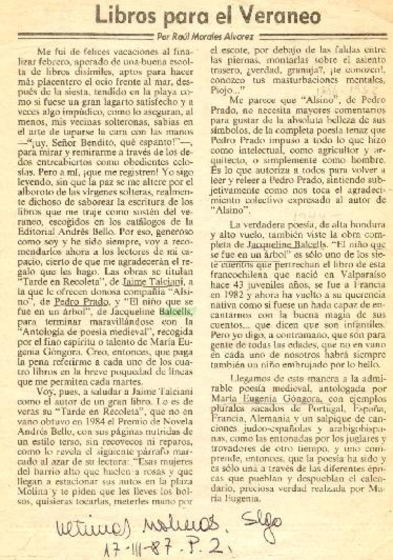 Libros para el veraneo [artículo] Raúl Morales Alvarez.