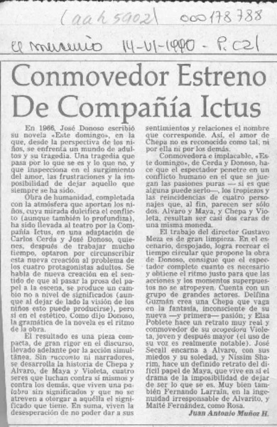 Conmovedor estreno de compañía Ictus [artículo] Juan Antonio Muñoz H.