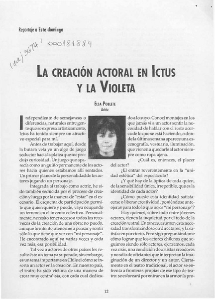 La creación actoral en Ictus y la Violeta [artículo] Elsa Poblete.