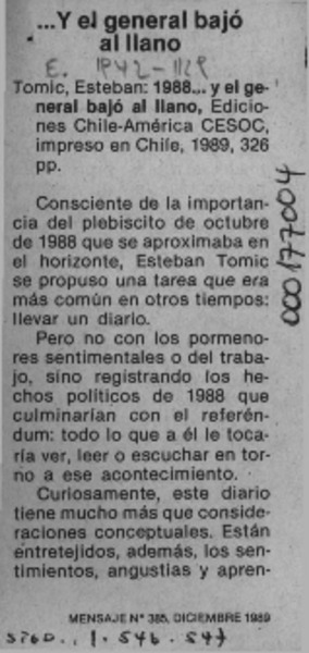 TOMIC ERRAZURIZ, ESTEBAN - 1988 -- Y EL GENERAL BAJO AL LLANO