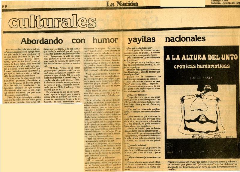 Autores chilenos - [entrevista] - Sasia, Jorge - La Nación (Santiago, Chile)-- - A la altura del unto