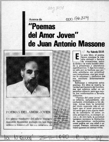 "Poemas del amor joven" de Juan Antonio Massone [artículo] Rolando Silva.
