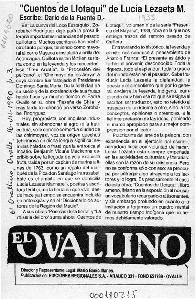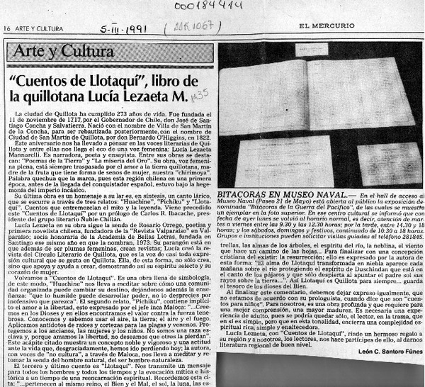 "Cuentos de Llotaqui", libro de la quillotana Lucía Lezaeta M. [artículo] León C. Santoro Funes.