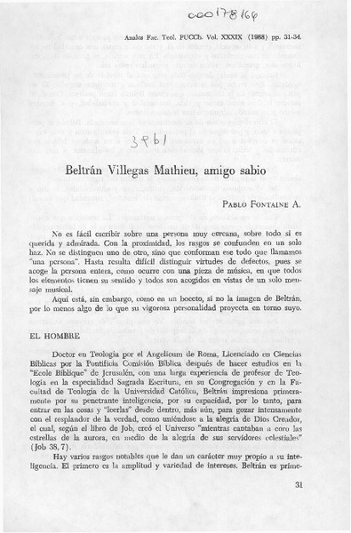 Beltrán Villegas Mathieu, amigo sabio [artículo] Pablo Fontaine A.