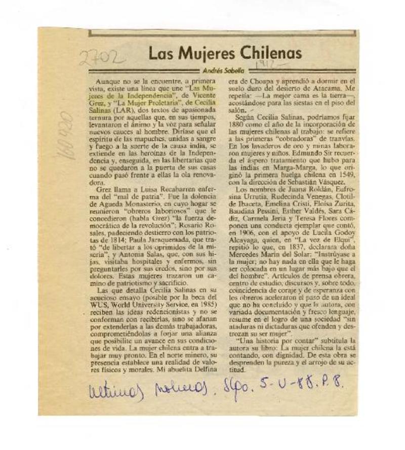 Las mujeres chilenas [artículo] Andrés Sabella.